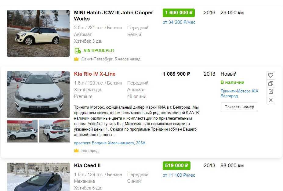 Популярный сайт объявлений, который содержит информацию о новых и подержанных авто от частных и юридических продавцов. К основным достоинствам Авито относят удобную систему фильтрации — можно ввести подробные данные о модели, годе выпуска, стоимости и пр. Объявления размещаются бесплатно и показываются на протяжении месяца, после чего их нужно давать повторно.