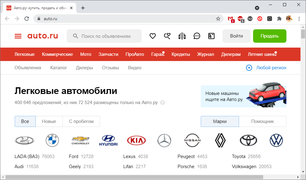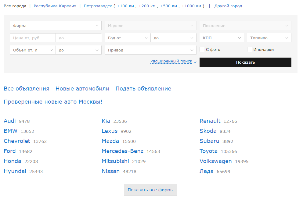 Продавцами могут выступать компании и частные лица, поэтому в каталоге достаточно новых и подержанных автомобилей. Проще всего заглянуть в каталог марок, но можно воспользоваться поиском, настроив его под себя. Также имеется разделение по регионам.