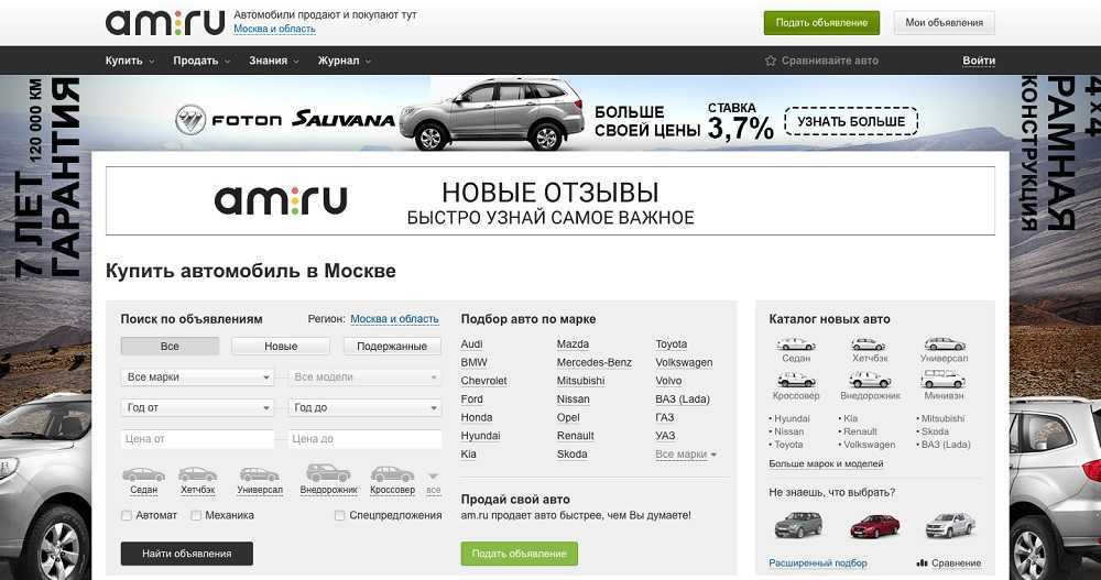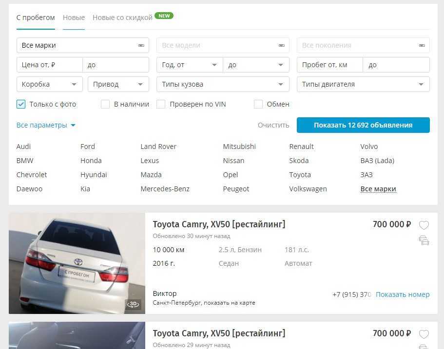 Работая на вторичном рынке России более 20 лет, auto.ru охватывает все регионы страны и имеет большое число фильтров, ускоряющих поиск нужного автомобиля. Имеется услуга проверки предложений в сервисных центрах компании с детальной информацией по выявленным недостаткам с фотоотчетами – полезная фишка, если планируется покупка машины с пробегом в другом городе (регионе).