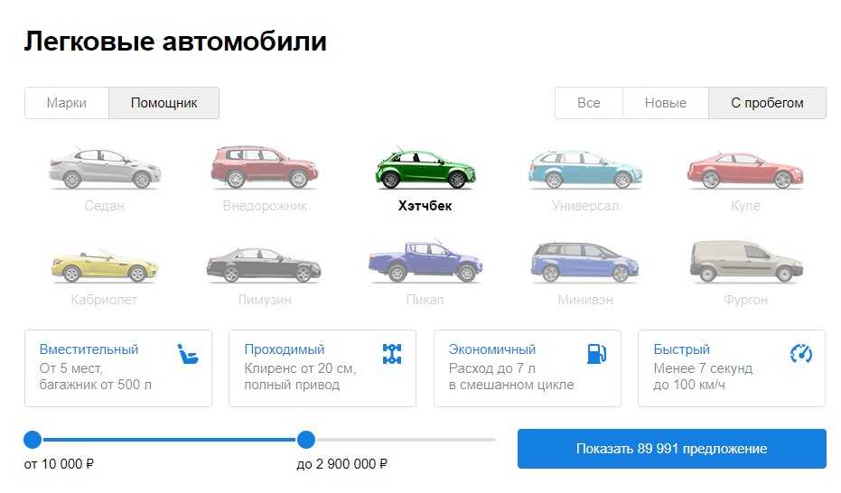 Чтобы найти машину для покупки на youla.ru, воспользуйтесь формой для поиска, указав марку, диапазон цен, год выпуска и другие параметры и нажмите «Показать объявление».