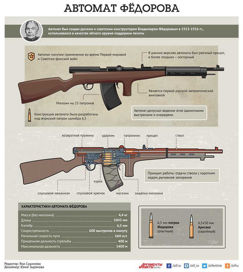 Русский оружейник В. Г. Федоров с 1913 года вел работу над оружием, сочетавшим в себе относительную легкость винтовки и автоматический огонь пулемета. Также он разработал под новое оружие специальный патрон, легче винтовочного, но тяжелее пистолетного – в дальнейшем такие назовут «промежуточными».