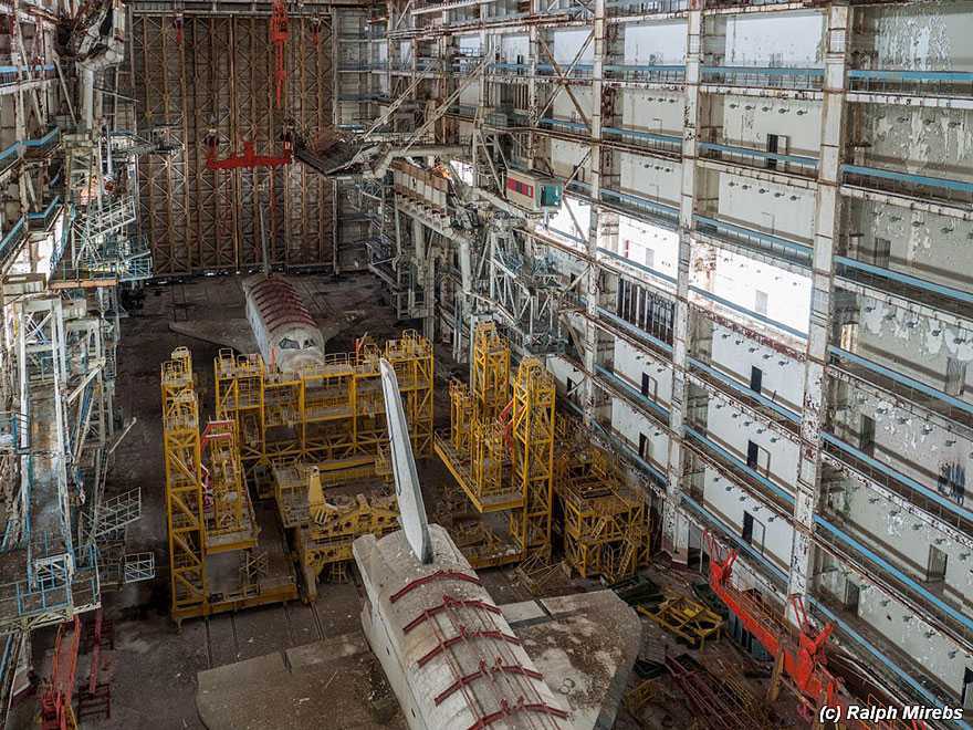 На этой фотографии, снятой из ангара Энергия-М, изображен заброшенный ангар с двумя челноками Буран