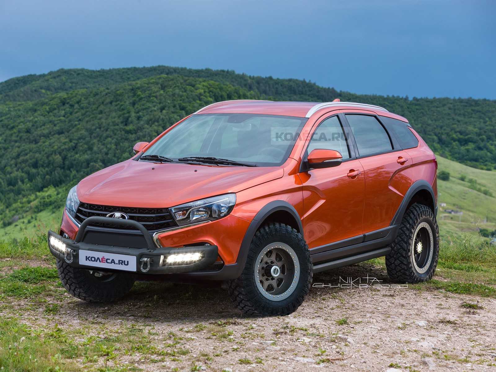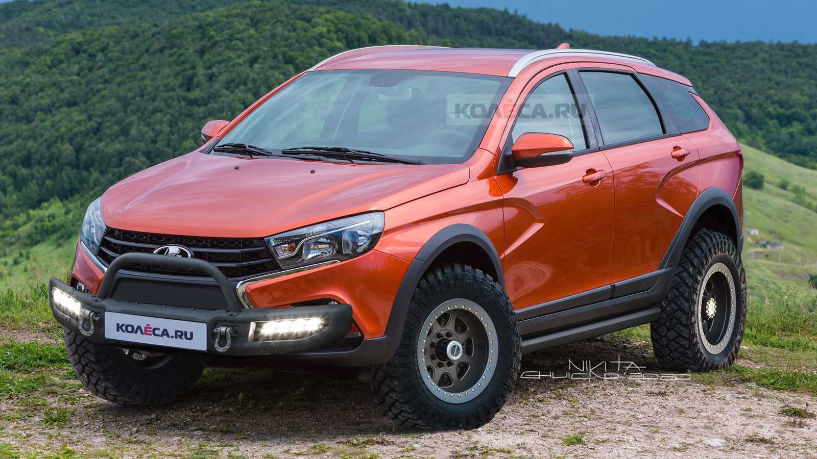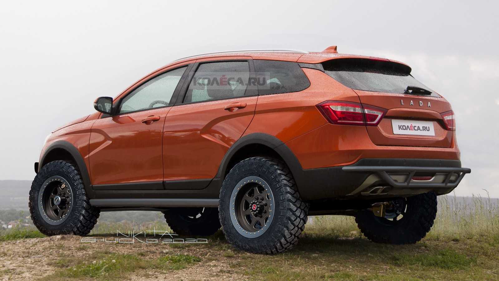 Представленный на рендерах универсал Веста имеет значительно увеличенный дорожный просвет, не в последнюю очередь за счёт высокопрофильных «зубастых» покрышек. Диски по диаметру, кстати, аналогичны устанавливаемым на базовый Vesta Cross. Автомобиль обзавёлся силовым передним бампером с дополнительной светотехникой и буксировочными проушинами, порогами и защитой заднего бампера.