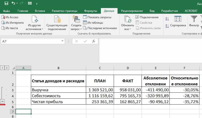- Нажатие на минус скроет столбцы, и “–” превратится в “+“. Нажатие на плюс моментально отобразит все скрытые в этой группе столбцы.