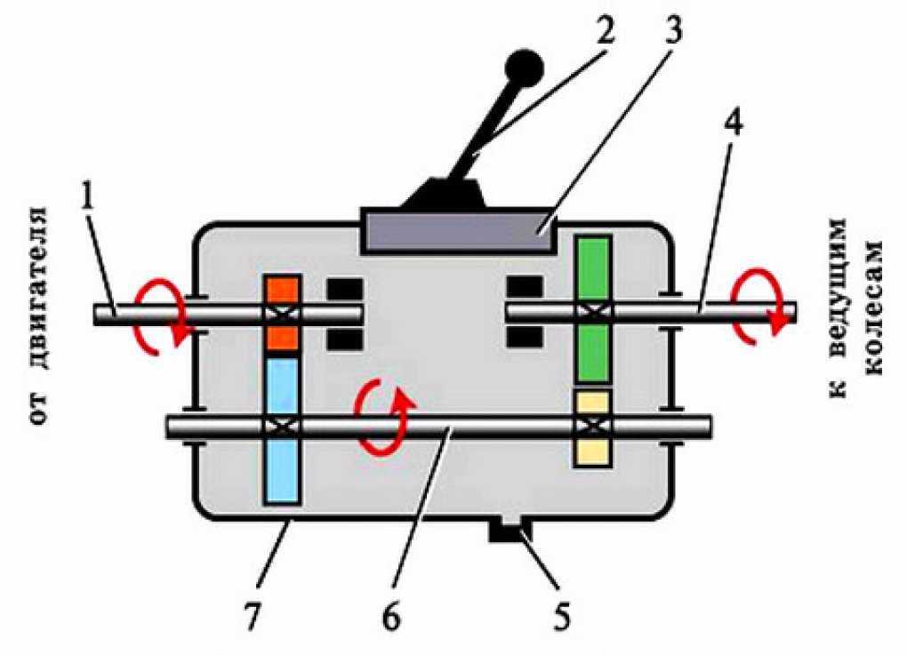 Принцип работы механической КПП следующий: крутящий момент от двигателя через сцепление передается на первичный вал коробки передач, далее преобразуется при помощи пар взаимодействующих между собой шестерен и затем передается на колеса. Каждая пара шестерен (ступень) имеет определенное передаточное число, которое преобразует скорость вращения и крутящий момент коленвала двигателя. Причем если передача увеличивает крутящий момент, то скорость вращения уменьшается и наоборот. В первом случае передача будет называться понижающей, а во втором — повышающая.