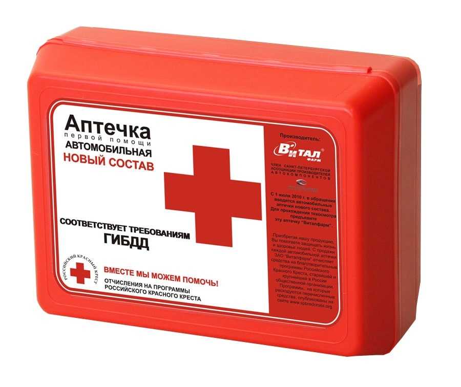 Необходимо отметить, что инструкция и футляр являются тоже обязательными частями – поэтому нельзя просто набрать в ближайшей аптеке бинтов, пластырей и прочего, а после сложить в пакет и закинуть в бардачок
