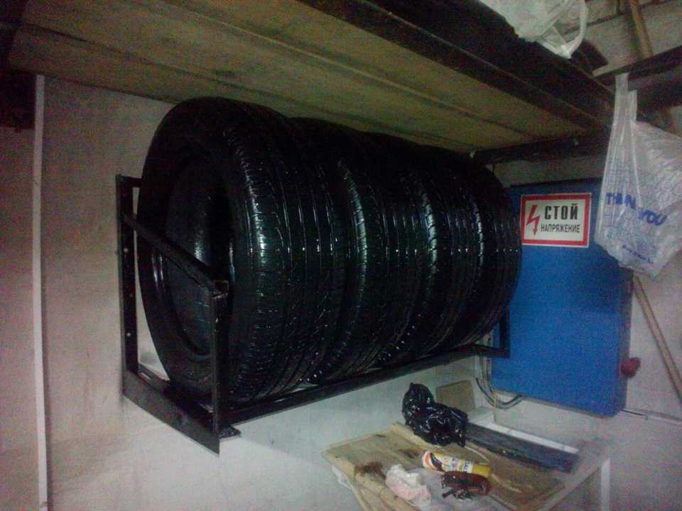 Внешне кронштейны похожи на полки. Обычно сварены из металлического профиля. Позволяют ставить резину вертикально, при этом не занимая много места.