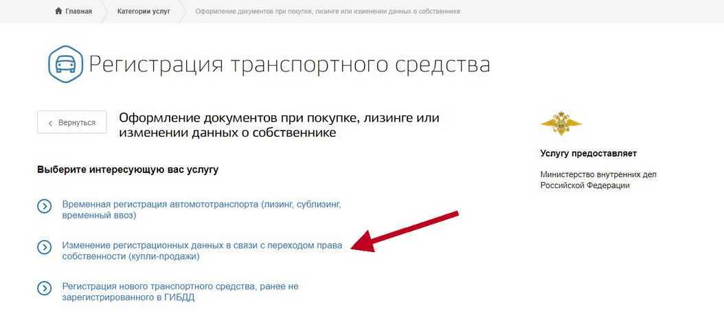 Второе заявление, о постановке автомобиля на регистрационный учёт, заполняется в другом разделе «Оформление документов при покупке, лизинге или изменении данных о собственнике» – затем нужно выбрать услугу «Изменение регистрационных данных в связи с переходом права собственности (купли-продажи)»