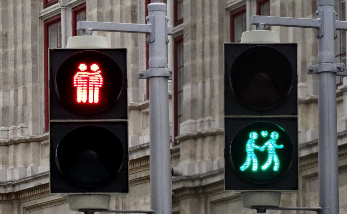 В Осло для обозначения красного сигнала на пешеходном светофоре используют две стоящие фигуры человечков, чтобы слабовидящие люди видели, когда нужно стоять, а когда идти.