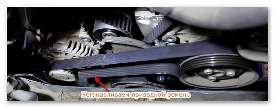 - Удерживая натяжение, чтобы ремень не соскочил, надо зацепить его за верхнее колесо и за шкив от водяного насоса.