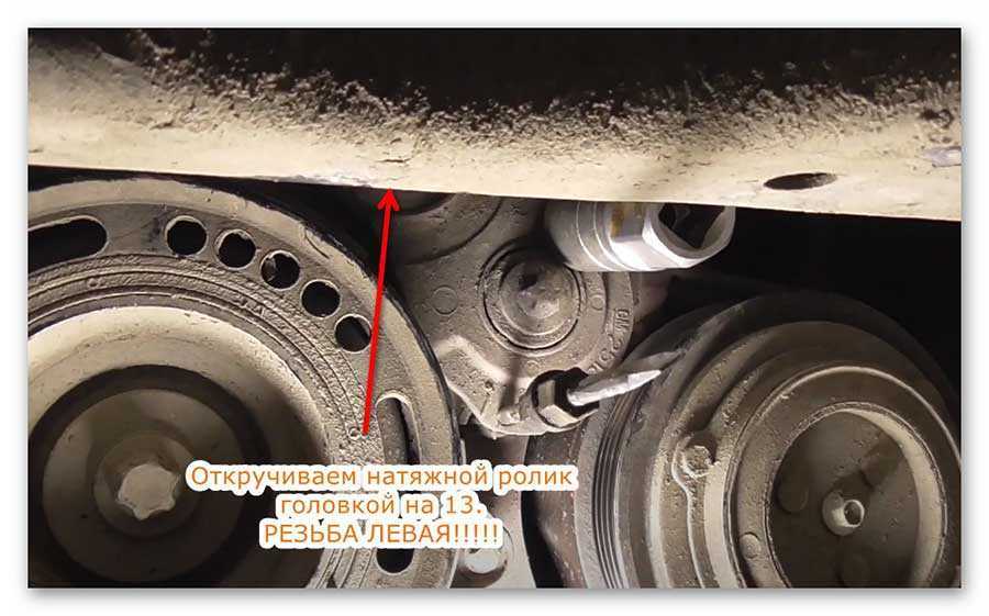 Для ослабления натяжителя используем головку на 19. Смещаем ключ в сторону лобового стекла.