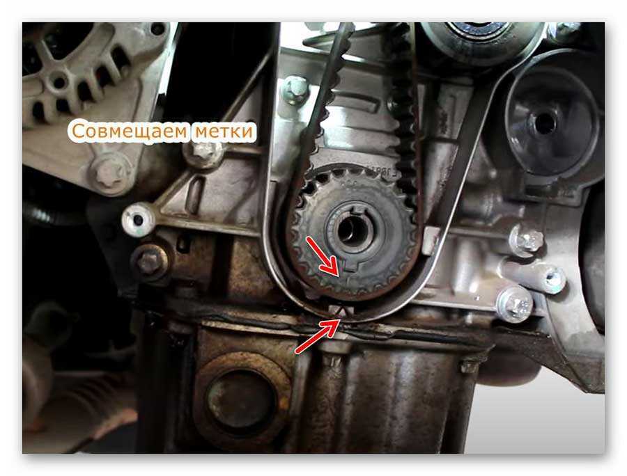 Важно проследить, чтобы метка на ремне соединилась с указателем на распредвале. Чтобы не запутаться, надписи на ремне тщательно изучают: часть со стрелками и надписями о производителе — это верх ремня