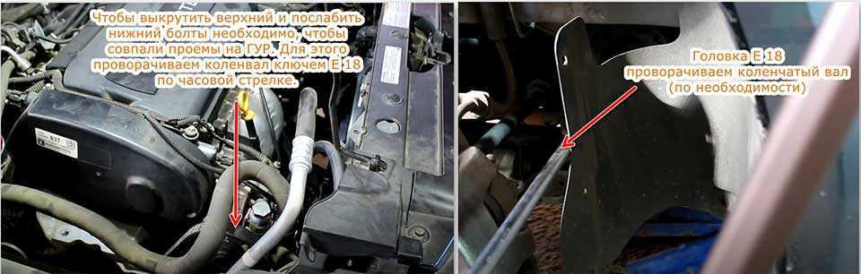 Головкой Е18 проворачиваем коленвал до тех пор, пока отверстие в шкиве не со впадётся с верхним болтом.