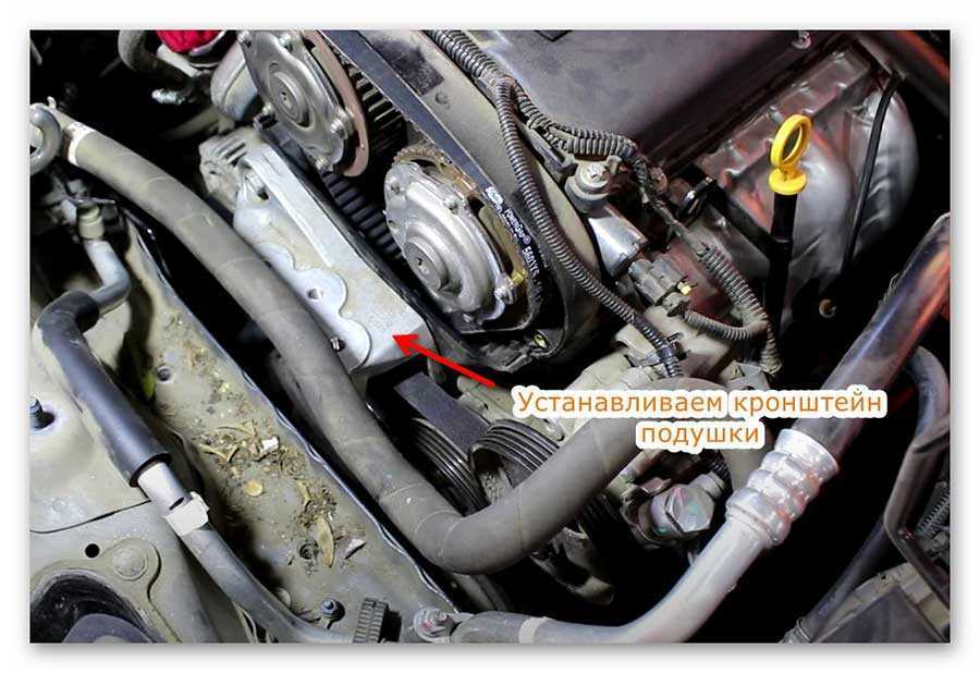Затем нужно открутить 5 болтов на 16, соединяющих правую опору мотора, кузов и крышку привода ГРМ. После этого убирают опорный узел.