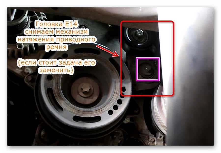 Снизу головкой Е14 ослабляем болт механизма натяжения приводного ремня и снимаем последний (если стоит задача его заменить).