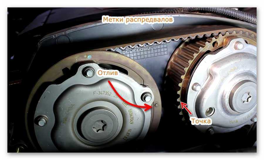 Выставляем метки распредвала. На правом точка, на левом отлив. Они должны совпадать.