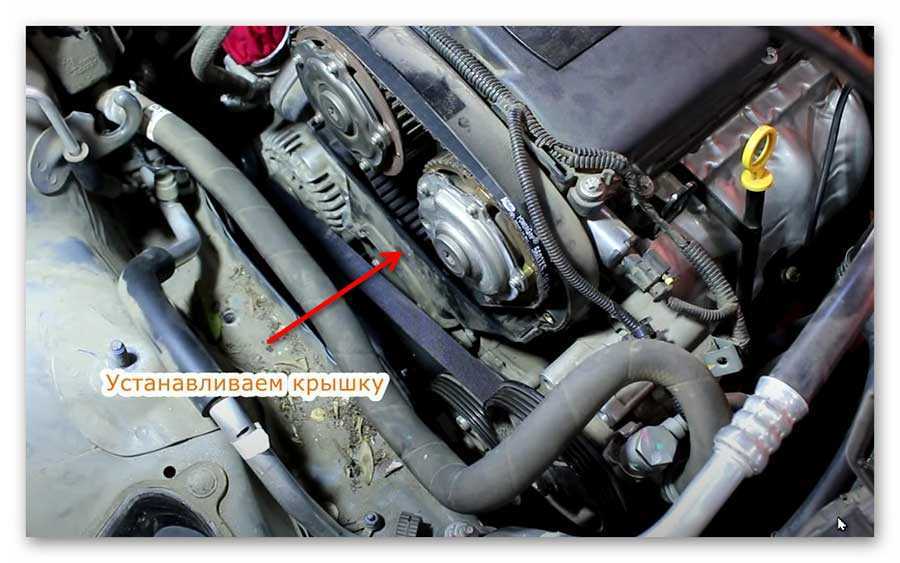 Проверяют метки, регулируют и прикручивают натяжной ролик. Натяжка должна позволять завернуть ремень на его прямой части, но он не должен поворачиваться на 180 градусов. Затем обратно прикручивается шкив, одевается ремень генератора. Генератор отжимают, натягивают генераторный ремень и закручивают. Прикручивают крышку короба.