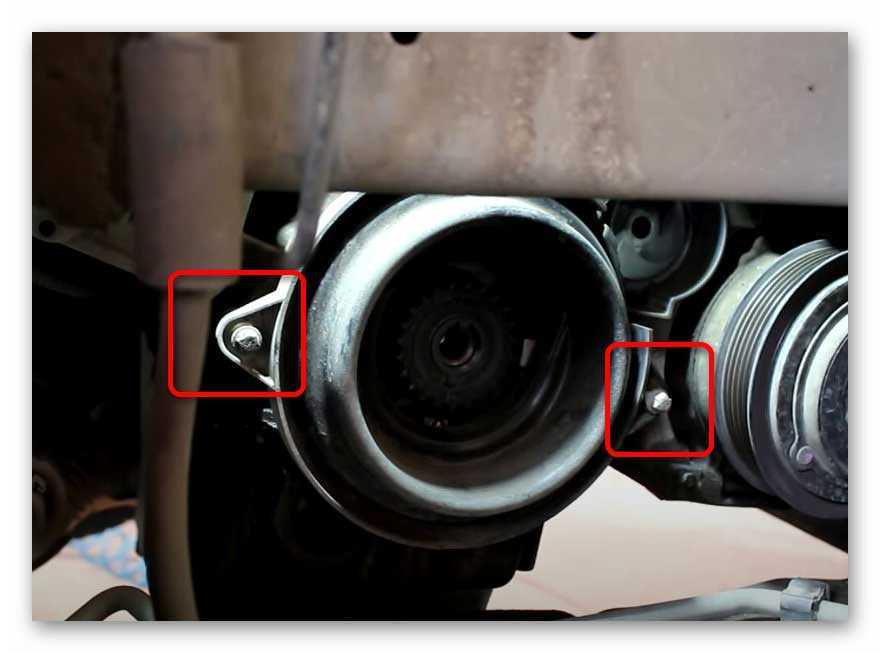 Чтобы снять приводные ремни нужно послабить крепление шкива насоса гидроусилителя руля. Верхний болт откручивается полностью, а нижний послабляется.