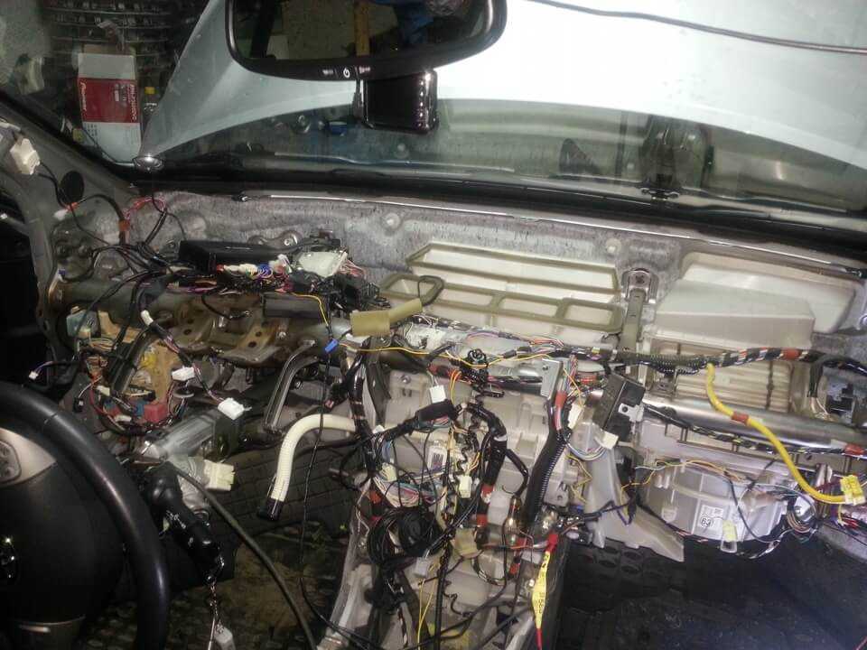 - Снимаем тросик открытия бензобака с панели, и отщелкиваем левую часть приборки со стороны водителя. Отсоединяем разъемы боковых воздуховодов.