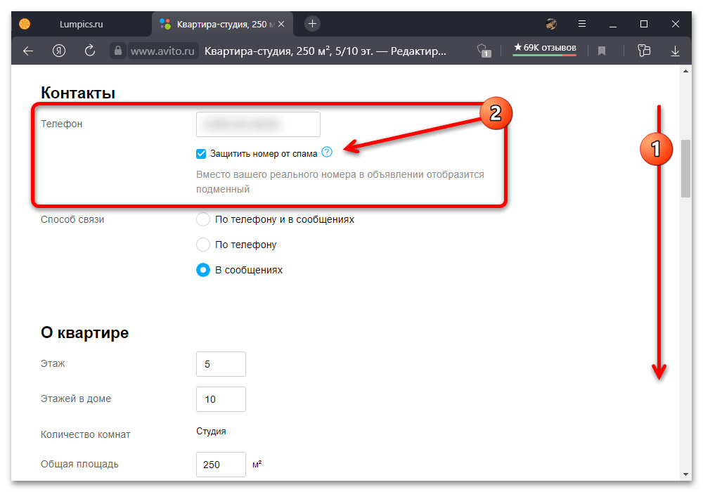 Важно понимать, что сама по себе функция представляет собой средство проверки и переадресации звонков на указанный вами реальный номер, поэтому полного скрытия добиться не получится. При этом, если вы все же хотите полностью избавиться от телефона на странице публикации, попросту следует выбрать внутренний чат из доступных способов связи