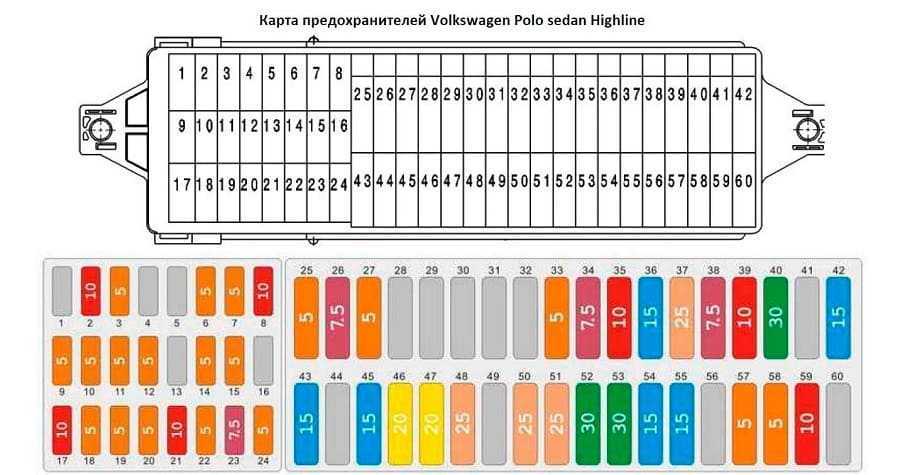 На обратной стороне крышки блока изображена карта расцепителей. Для каждого предохранителя указаны номер, под которым он установлен, номинальный ток и защищаемое устройство. Например, в Volkswagen Polo 5-го поколения расцепитель для прикуривателя стоит на позиции F42, на чертеже рядом с его обозначением проставлены буквы CIG (сокр. от cigarette). Расшифровка значков и литерных сочетаний приведена в инструкции к авто.