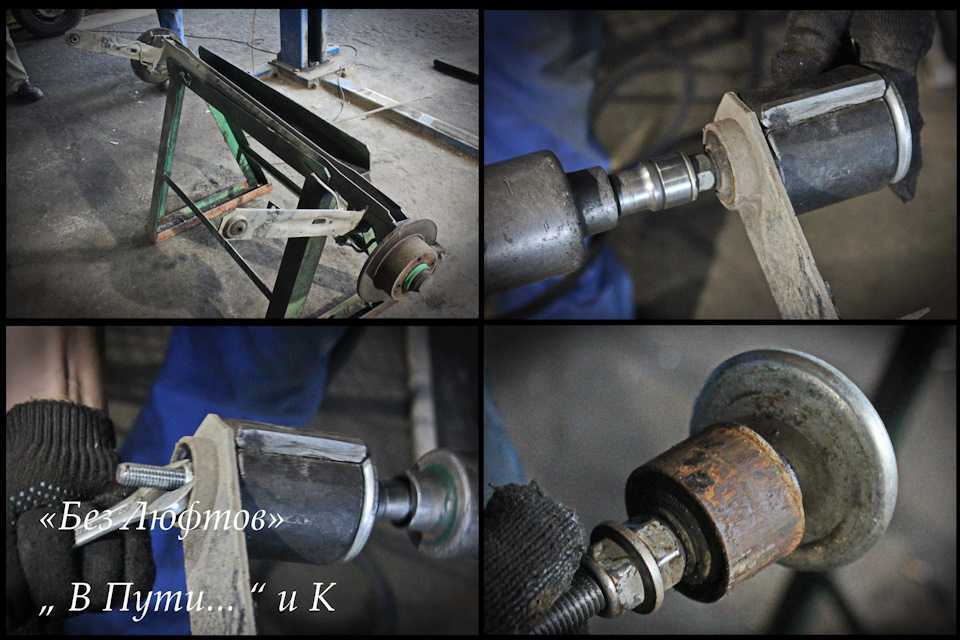 Выпрессовка рычажных сайлентблоков производится трубкой с внутренним диаметром 48 и поворотной головкой на 27. После этого, используя обе заготовленные трубки, производится установка новых сайлентблоков при помощи пресса или слесарных тисков.