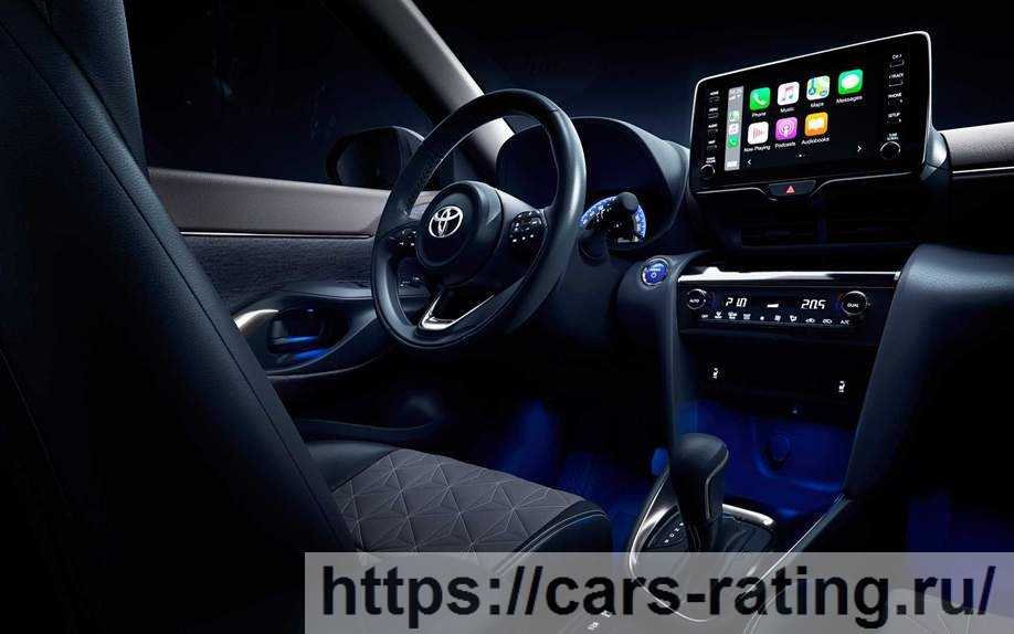 Спереди новинка производит вид строгой, мощной и динамичной машины. Интерьер меж тем является точной копией салона хэтчбекаЯрис 2020 года выпуска. Разве что стало больше свободного пространства для ног во втором ряду.