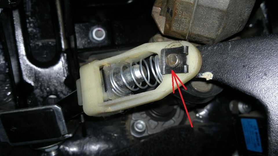 - Приподнимают педаль сцепления до самой верхней точки её траектории, после чего демонтируют скобу, а после этого и сам трос;