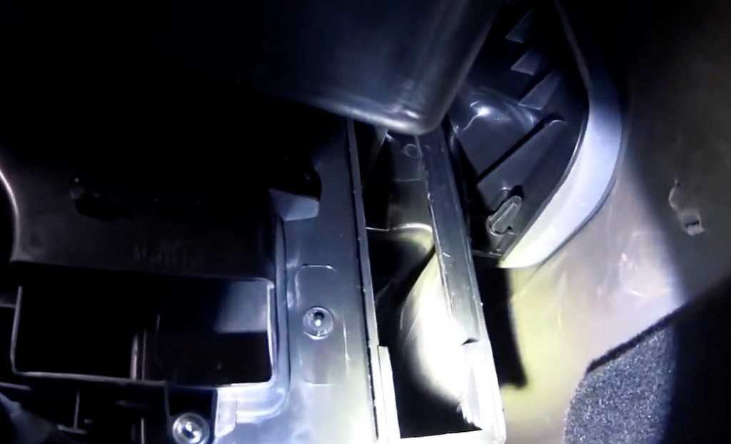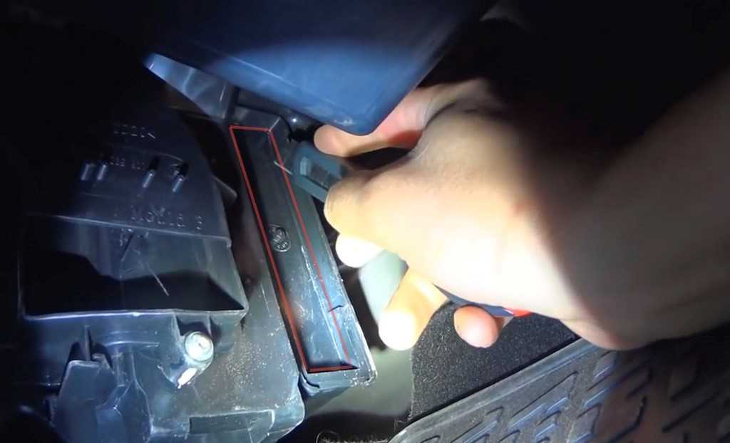Первым делом вам предстоит отыскать сам корпус под салонный фильтр. Для этого переместитесь на переднее пассажирское сиденье и загляните в район расположения ног. На тыльной стороне центральной консоли. Если проще, то около левой ноги переднего пассажира непосредственно под вещевым ящиком. Сам бардачок для этих целей снимать не обязательно. Некоторые разбирают полностью узел и вынимают корпус, чтобы иметь возможность где-то на столе разложить кожух и аккуратно оттуда вырезать лишнее. Но так вы потратите значительно больше времени и сил.
