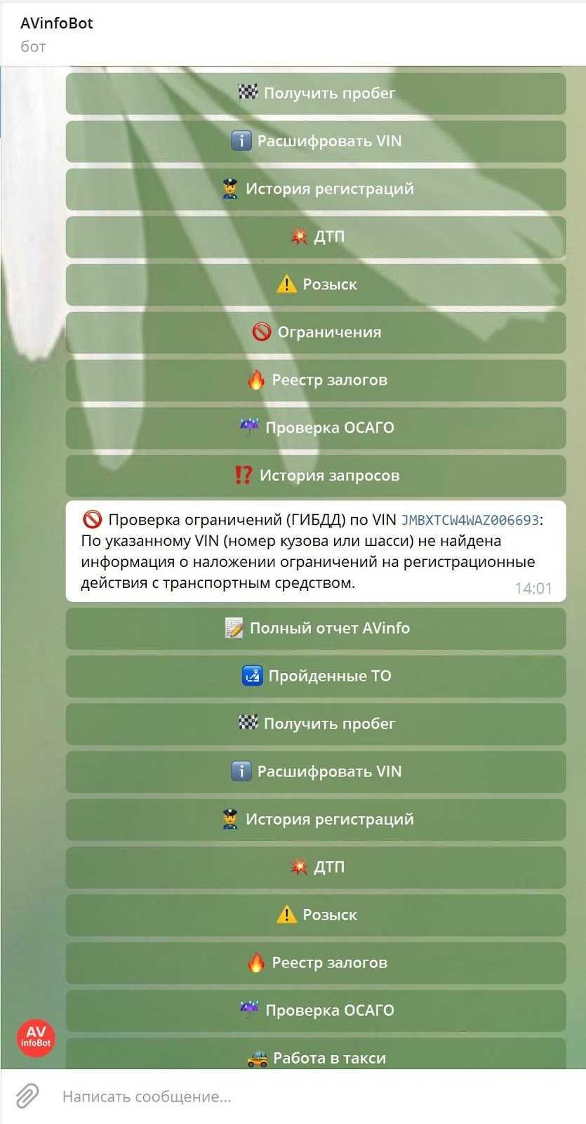 Для этого в мессенджере есть специальные чат-боты. Это ресурсы, которые позволяют получить определенный блок данных об автомобиле бесплатно. Например, для работы с ботом AvtoCodBot, необходимо: