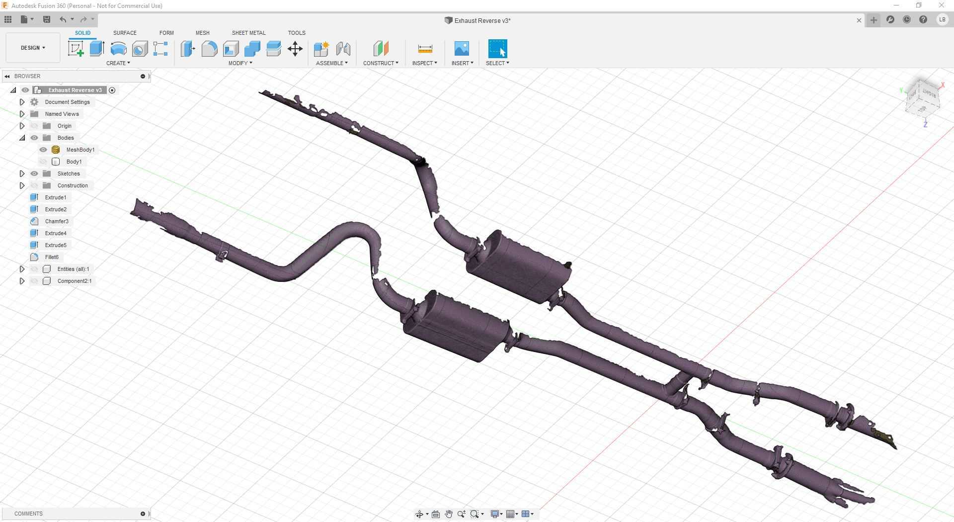 В данном случае по большей части применялась функция извлечения параметрических цилиндров из скана в области расположения труб и несколько плоскостей для расположения их в местах креплений и на торцах глушителя. Все, что требуется при использовании функции извлечения примитивов, – выделить область сетки там, где, по вашему мнению, должен находиться примитив, и программа с высокой точностью впишет параметрическую фигуру в выделенную область сетки.