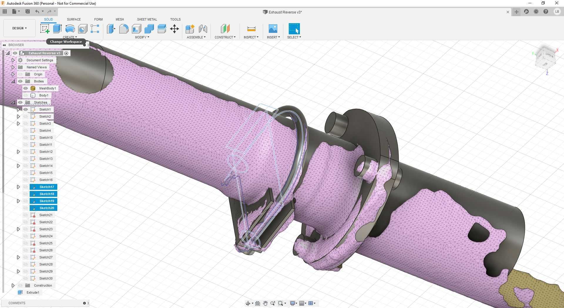 Пора приступить к вычерчиванию цилиндрических труб. Мы делаем это при помощи прямых линий, проходящих через оси цилиндров, которые мы извлекли из 3D-скана в peel 2 CAD.