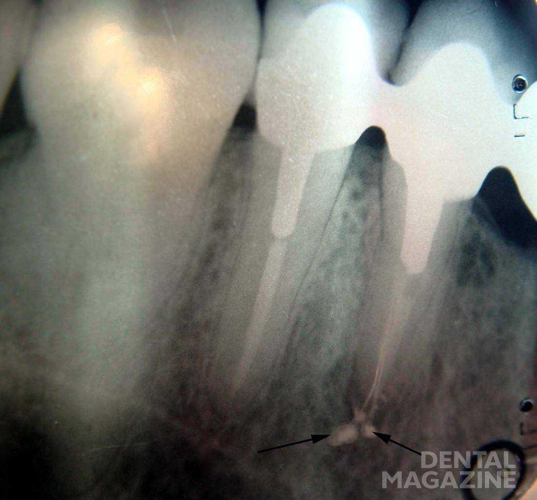 Выведение пломбировочного материала за пределы апикального отверстия наблюдается в случае использования большого количества силера, а также в результате избыточного давления в процессе конденсации пломбировочного материала в корневом канале.