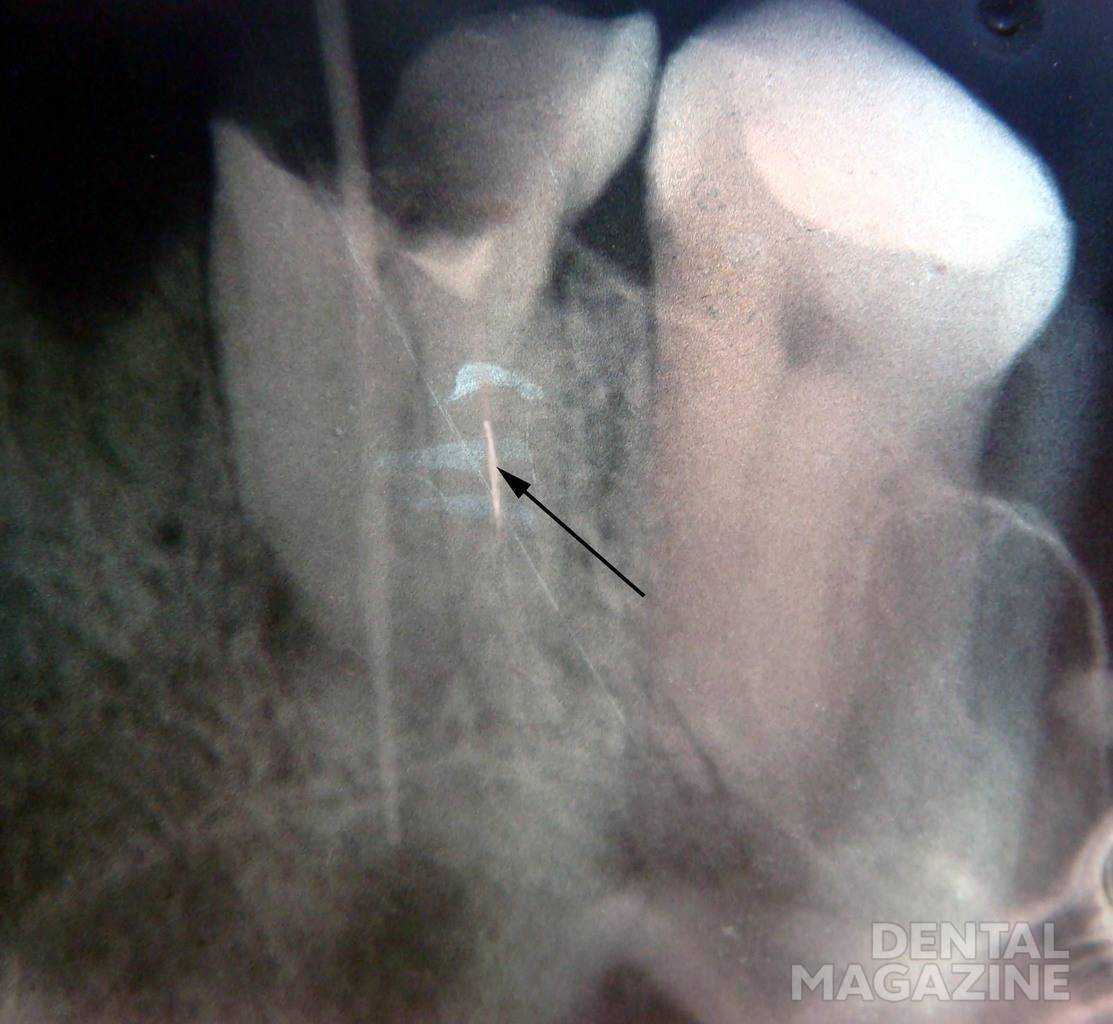 Выталкивание гуттаперчевого штифта за апекс может быть следствием неправильного определения рабочей длины и/или неверного выбора размера основного штифта (рис. 11).